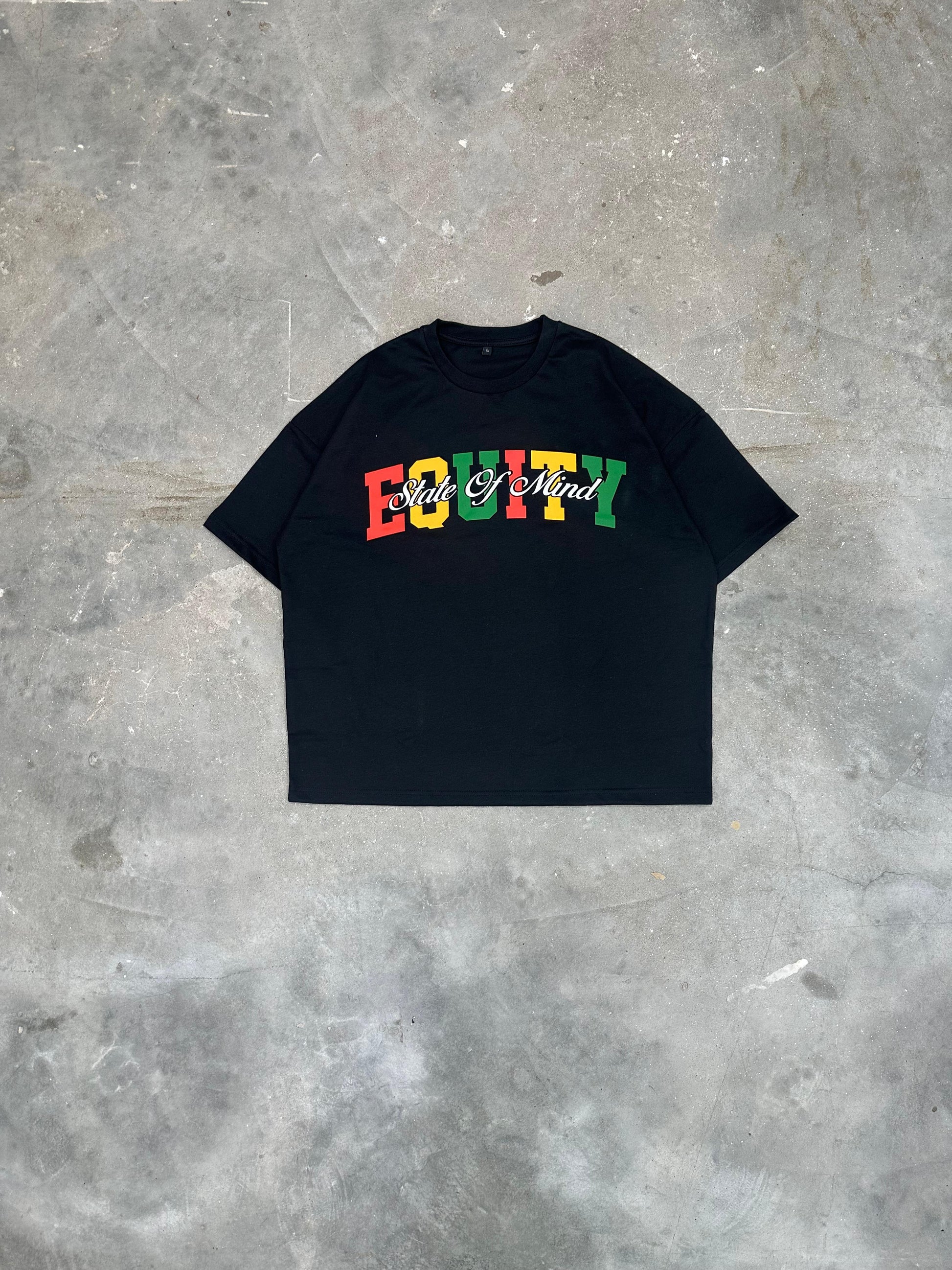 This bold black tee features “EQUITY” in red, gold, and green block letters, representing power, value, and legacy. The phrase “State of Mind” overlays the chest in clean white script, reminding the world that equity starts within.